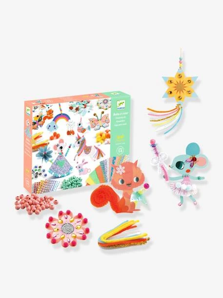 - Contenu : dans une grande boîte de matériel sur 2 étages avec des assortiments de perles, pompons, yeux mobiles, stickers, pierres précieuses, fils chenilles… et des cartons imprimés + 15 fiches d’idées.