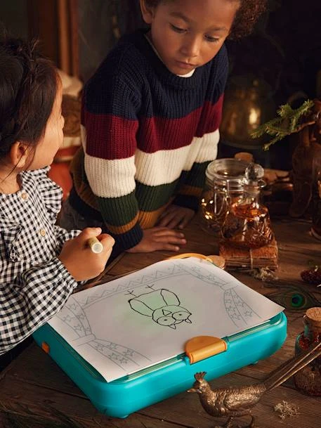 Avec Dessinéo, votre enfant réussit à coup sûr ses dessins. Il lui suffit de choisir un modèle parmi tous ceux proposés, de le placer sur la roue et de poser une feuille de papier sur le pupitre lumineux. Etape par étape, il commence à dessiner les silhouettes d’animaux ou de personnages, puis tourne le support du disque modèle afin de faire évoluer l’illustration et les détails, jusqu’à obtenir l’image finalisée. Ce pupitre permet un apprentissage facile du dessin et peut être facilement transporté grâce à sa poignée.