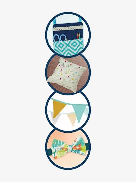 o Nombreux accessoires : canettes en métal, aiguilles, bobines, fermoir, coupon de tissu….
